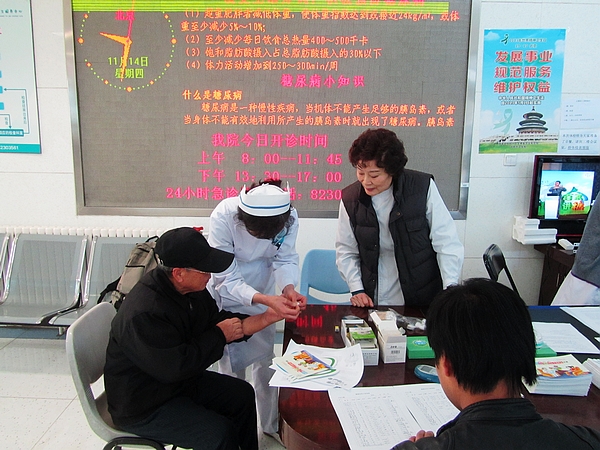 2013年11月14日是第七个联合国糖尿病日。当日,北京语言大学社区卫生服务中心在中心门诊大厅开展了相应宣传活动,并免费为周边居民进行了血糖、血压、BMI检测等。