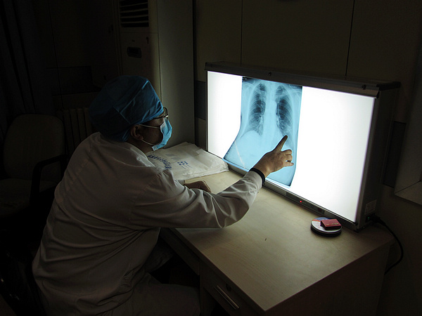 放射科拍胸片,胸片示毛玻璃样变,考虑为疑似病例