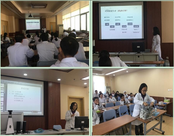 首先,我院刘红医生给大家详细讲解了心肺复苏最新指南(2015版)具体内容并现场使用模拟人生演示了操作规范,紧接着白成丽医生给大家讲解了除颤仪的使用适应症及操作流程。大家都在学习过程中不断更新知识。